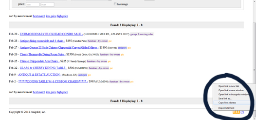 If you’re stalking craigslist every day for that perfect set of Chinese Chippendale chairs, stalk no more! Have new listings sent to your RSS feed every time they’re posted. Just type in your search, and on the search results page, click on the orange “RSS” button on the bottom and add it to your feed.